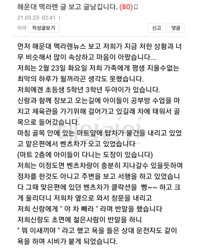 - 또한 글쓴이는 '지나가는 벤츠만 봐도 몸이 굳고 긴장한다. 왜 애들이 이런 고통을 받아야 하는지'라고 억울함을 호소.