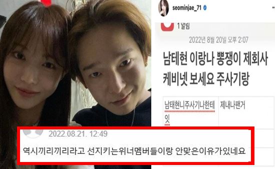 서민재는 2022년 8월 20일 남태현과 찍은 사진을 인스타르갤멩 올리며 각자의 필로폰 투약을 주장하는 글을 적었습니다.