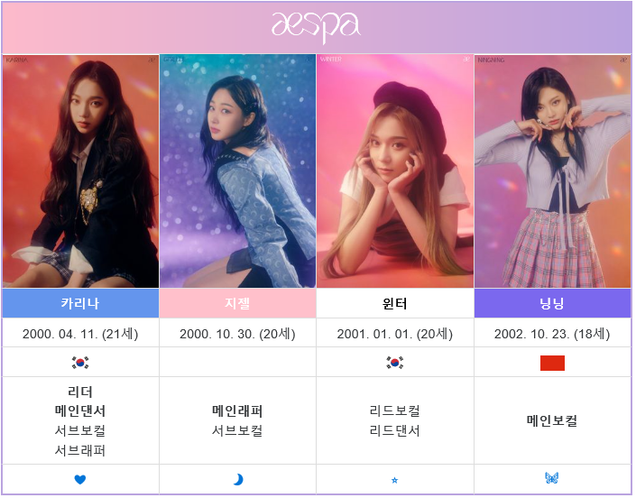 에스파 카리나 본명 나이, 지젤 본명 나이, 윈터 본명 나이, 닝닝 본명 나이 및 역할은 아래와 같습니다.