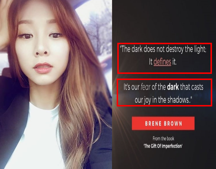 4월 16일 오늘 지나 인스타그램에는 글이 하나 올라왔습니다. 지나는 '빛을 파괴하는 것은 어둠이 아니다, 어둠은 빛을 정의한다, 우리의 즐거움을 그림자 속으로 내던지는 것은 어둠에 대한 두려움이다' (The dark does not destroy the light; It defines it. It's our fear of the dark that casts our joy in the shadows.)라는 글을 올렸습니다.