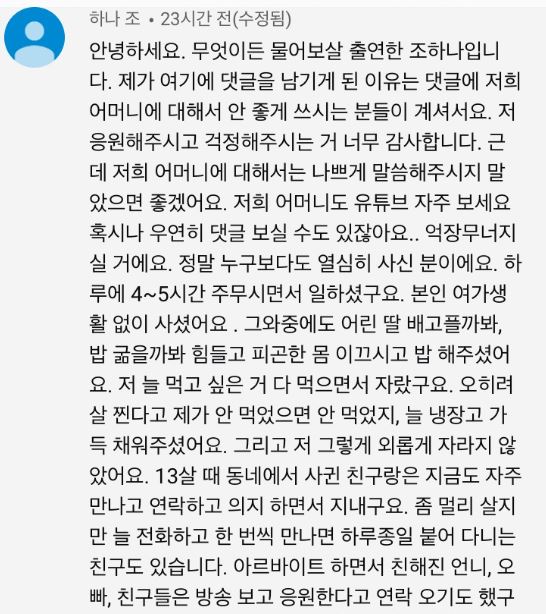 조하나는 해당 방송이 나간 뒤 해명 댓글을 직접 남기기도 했는데, 부친과 모친에 대한 비난이 이어졌기 때문입니다. 조하나는 '어머니도 정말 누구보다 열심히 사신 분'이라며 '하루에 4~5시간 주무시면서 일했고 본인 여가 생활 없이 살았다'라고 했습니다.