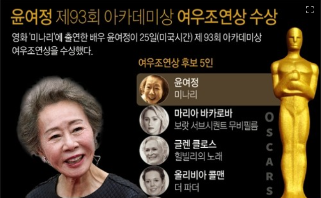 윤여정의 여우조연상 수상은 작품상과 감독상, 각본상, 국제영화상을 휩쓸며 할리우드와 세계 영화계에 지각변동을 일으킨 기생충 조차 해내지 못한 성과입니다.