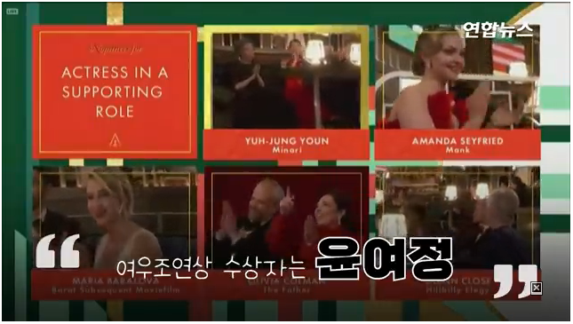 윤여정은 함께 후보에 오른 배우 중 유일한 아시아 배우였는데다, 아카데미 시상식은 ▶마리아 바칼로바( 보랏 서브시퀀트 무비필름) ▶글렌 클로즈(힐빌리의 노래) ▶올리비아 콜맨(더 파더) ▶아만다 사이프리드(맹크)와 함께 여우조연상에 이름을 올렸습니다.