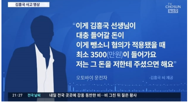 오토바이 운전자로부터 공갈과 협박을 받고 있다고 주장한 김흥국은 녹취록도 공개했습니다. 오토바이 운전자는 통화에서 '김흥국 선생님이 뺑소니 혐의가 적용됐을 때 대충 들어갈 돈이 최소 3,500만 원이 들어간다. 전 그 돈을 나한테 줬으면 한다' 말했습니다.