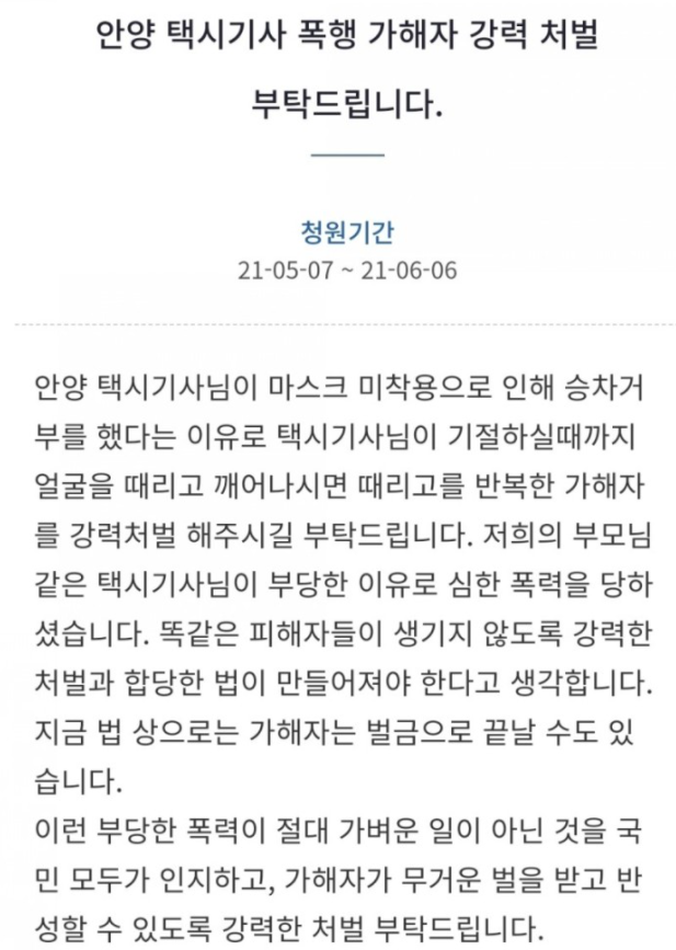 현재 주요 인터넷 커뮤니티에서는 A씨의 택시기사 폭행 장면 영상이 확산되고 있으며, 청와대 국민청원 게시판에도 A씨를 엄정하게 처벌해달라는 청원이 올라온 상태입니다.