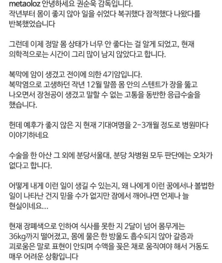 권순옥 감독은 5월 10일 자신의 인스타그램에 '복막에 암이 생겼고 전이에 의한 4기암'이라고 자신의 상태를 전했습니다. 권순옥 감독은 '의학적으로 시간이 그리 많이 남지 않았다. 예후가 좋지 않은지 현재 기대 여명을 병원마다 2~3개월 정도로 이야기한다'라고 밝혔습니다.