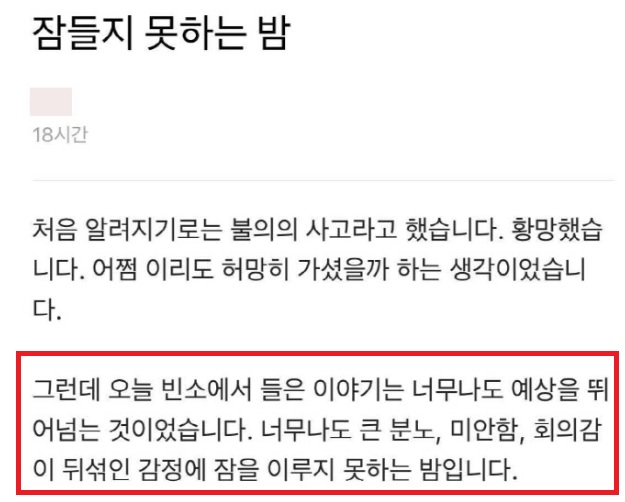 A씨 빈소에 다녀왔다는 네이버 직원 C씨는 블라인드에 "빈소에서 들은 이야기는 너무나도 예상을 뛰어넘는 것이었다. 큰 분노, 미안함, 회의감이 뒤섞인 감정에 잠을 이루지 못했"고 말했습니다.