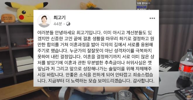 - 2021년 6월 2일, 최고기는 유튜브 채널 '최고기 ENTJ'를 통해 다음과 같은 글을 게재