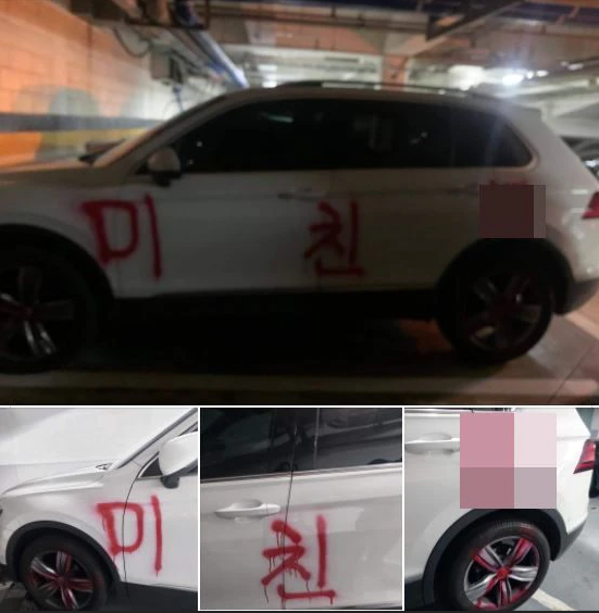 A씨의 흰색 SUV에는 "미친X"이라는 욕설이 적혀 있었고 앞뒤 타이어 2개에도 붉은 페인트가 묻어 있었습니다. 차량에 설치된 블랙박스는 주차 중에는 작동이 되지 않는 것으로 파악됐습니다.