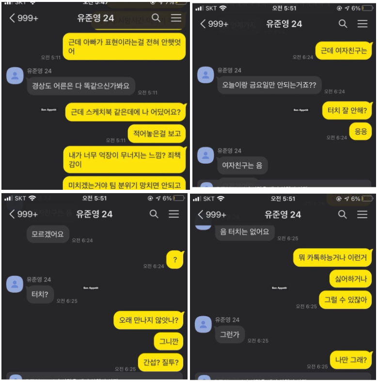 - 이어 "얼마 전 전 여자친구가 올려주신 네이트 판 글과 둘 사이의 카톡 내용들 보고 유 씨에게 솔직한 이야기들 다 들었습니다 전부 거짓말이었습니다. 그렇기 때문에 전 여자친구 입장을 제가 다 생각해 볼 수 있었습니다"라고 말함.