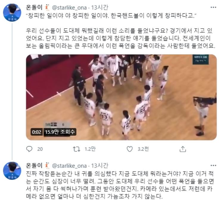 이 부분은 짧은 영상으로 편집돼 온라인에 올라왔습니다. 영상을 올린 네티즌은 "전세계인이 보는 올림픽이라는 큰 무대에서 이런 폭언을 감독이라는 사람한테 들었다"라며 "듣는 순간 내 귀를 의심했다. 카메라 있는데서도 저런데 카메라 없으면 얼마나 더 심한건지 가늠조차 가지 않는다"고 트위터를 통해 말했습니다.