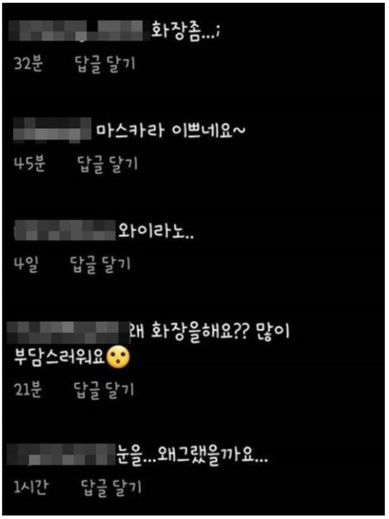 끝으로 김인혁은 "더 수많은 얘기들도 많지만 변명할 필요 없다 생각해왔지만 이제 그만해주세요"라고 부탁했습니다. 이와 함께 김인혁은 자신의 SNS에 달린 악플들을 캡처한 사진을 공개하기도 했습니다. 김인혁이 공개한 악플에는 "왜 화장을 해요? 많이 부담스러워요", "마스카라 이쁘네요", "왜이래"등의 댓글이 달려있습니다.