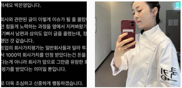 박은영은 2021년 9월 8일 자신의 인스타그램에 "남편 회사와 관련된 글이 이렇게 이슈가 될 줄 몰랐다"라며 "그동안 힘들게 노력하는 과정을 옆에서 지켜봐왔기에 너무 기뻐서 남편과 상의도 없이 글을 올렸는데, 정말 경솔했던 것 같다"고 올렸습니다.