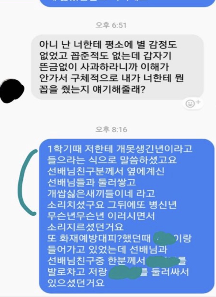 - C는 생활지도부에서 경위서를 쓰고, 학폭위를 열어달라고 요청했지만 졸업 등의 이유로 사과만으로 넘어갔고, 결국 본인은 정신과 치료를 받으며 아직까지도 힘든 시간을 보내고 있다고 함.