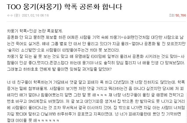 2월 16일 온라인 커뮤니티 네이트 판에 'TOO 웅기(차웅기) 학폭 공론화 합니다'라는 글이 올라왔습니다. 글쓴이 A씨는 '차웅기의 학폭과 인성 논란을 폭로하겠다'라며 '차웅기가 슈퍼맨인 것처럼, 대단한 사람으로 남는 건 싫다. 술자리 소신 발언으로 사람들이 떠받들어 주는 건 차마 못 보겠다'라며 글을 쓴 이유 밝혔습니다.