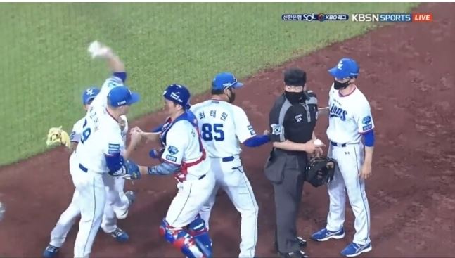 이후 몽고메리는 공 2개를 더 던져 장성우를 투수 라인드라이브 아웃 처리하고 이닝을 마쳤습니다. 하지만 문제는 이때부터 였습니다. 몽고메리가 김 주심에게 12초 투구 규정 위반과 강하게 항의했고, 김 주심은 몽고메리를 퇴장시켰습니다.