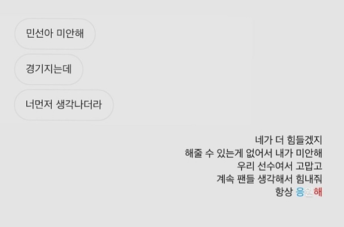 해당 DM에는 "민선아 미안해, 경기지는데 너 먼저 생각나더라"라는 글이 담겨 있었습니다. 이에 곽민선은 "네가 더 힘들겠지, 해줄 수 있는 게 없어서 내가 미안해"라며 "우리 선수여서 고맙고 계속 팬들 생각해서 힘내줘, 항상 응원해"라는 글을 남겼습니다.