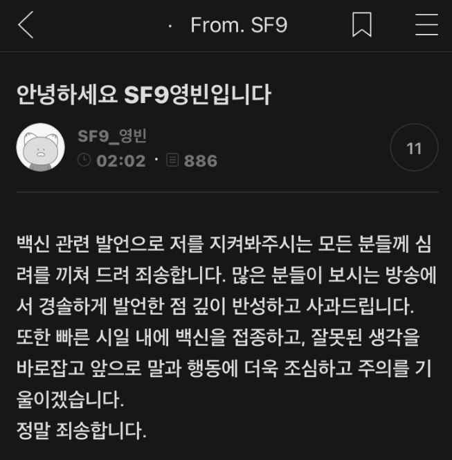안녕하세요, 그룹 SF9 영빈이 코로나 백신 불신 발언으로 논란이 일자 결국 사과했습니다.