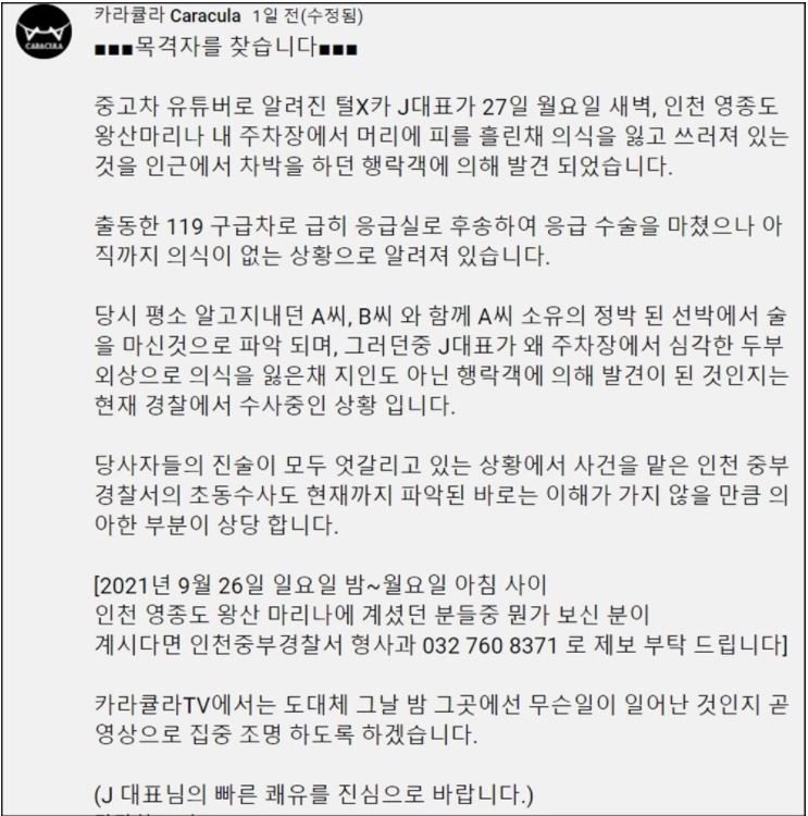 안녕하세요, 중고차 관련 유튜버가 인천 영종도의 한 야외 주차장에서 피를 흘리며 쓰러진 채 발견돼 경찰이 수사에 나섰는데 관련 내용 알아보겠습니다.