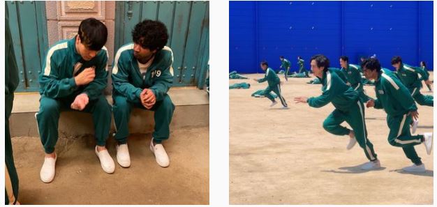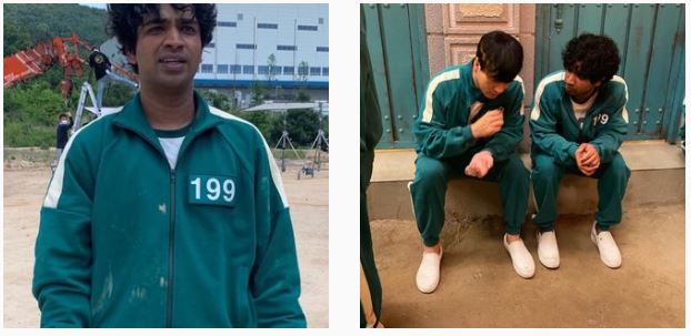 사진 속 아누팜 트리파티는 "오징어 게임" 속 서바이벌 참가자들의 트레이닝복 의상을 입은 채 미소를 짓고 있습니다. "199"라는 번호표와 그의 뒤편으로 분주해 보이는 현장의 분위기가 눈길을 끕니다다.