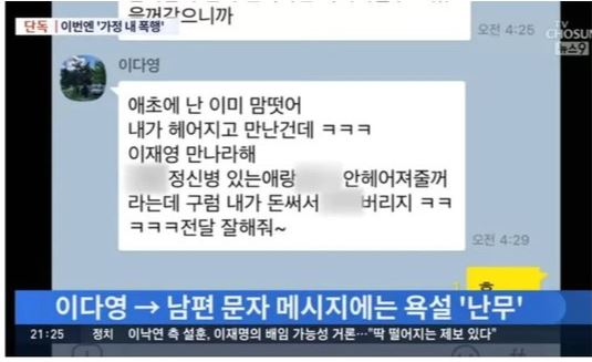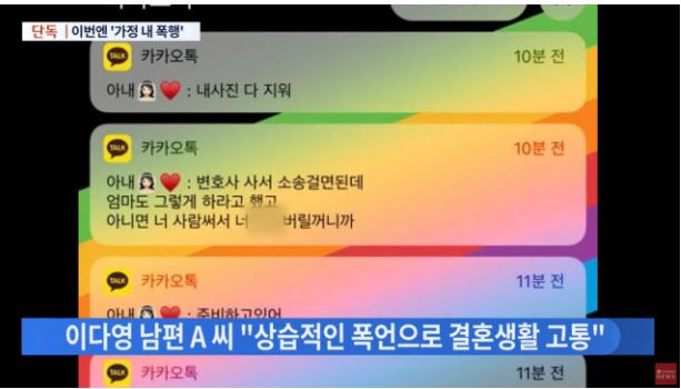 A씨가 공개한 카카오톡 메시지와 인스타그램 DM(다이렉트 메시지)에 따르면 "아내♥"라고 저장된 이다영은 "내 사진 다 지워. 변호사 사서 소송걸면 된대. 엄마도 그렇게 하라고 했고. 아니면 너 사람 써서 너 XX버릴 거니까. 준비하고 있어", "심장마비 와서 XX버려라" "너같은 XX이랑 살기 싫어" "이혼소송 걸 거야" 등의 막말을 했습니다.