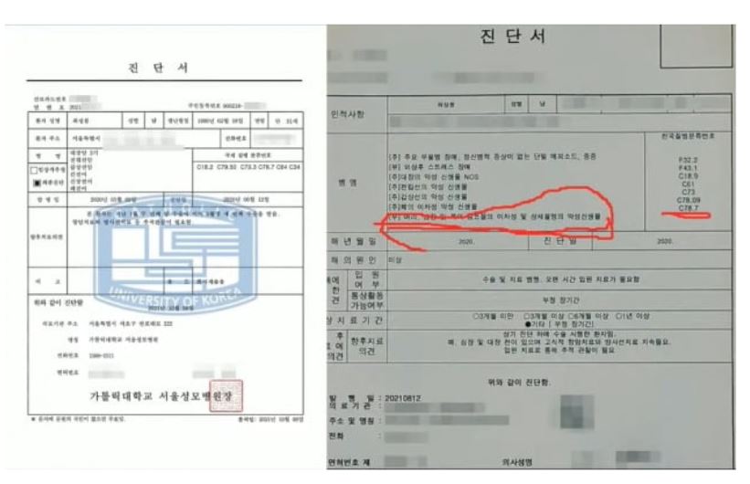 - 또한 진단서엔 대장암 3기라고 쓰여있는데 의료계에선 암이 타 장기에 전이가 되면 4기로 판단한다고 한다. 첫 번째 진단서와 두 번째 진단서의 코드명이 굉장히 상이하다. 두 자료가 의료기관에서 발급된 것이라면 다를 수 없다고 함.