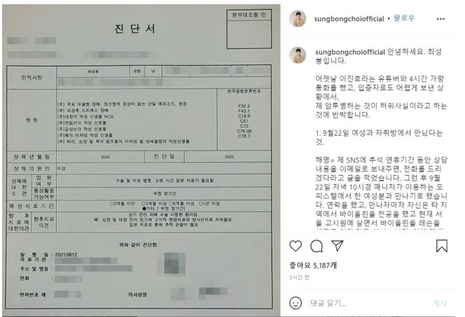 - 이어 질병명과 함께 기재된 질병코드도 허위라고 주장함. 근거로는 "앞서 보내온 1차 진단서에서도 잘못 기록됐다고 밝혔다. 질병명과 코드는 이른바 세트다. 한번 클릭으로 같은 라인에 동일하게 프린트된다. 다를 가능성은 제로다. 질병코드파일 확보해 확인해보니 최성봉의 진단서 질병코드는 존재하지 않거나 병명과는 다른 질병코드였다"고 말함.
