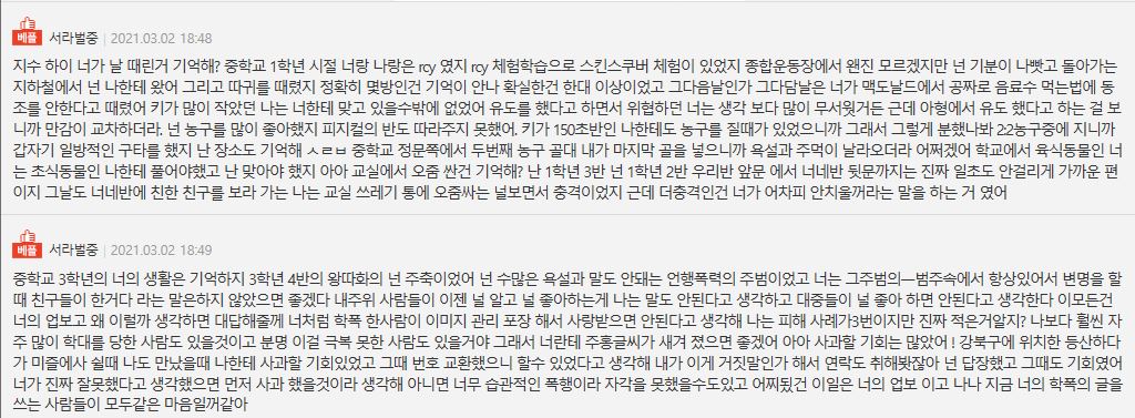 | '최예빈(펜트하우스 하은별) 학폭 말도 안된다' 동창들 반박글 등장(+반박글 캡쳐, 학폭논란 정리, 최예빈 프로필) (0) | 2021.03.02 |