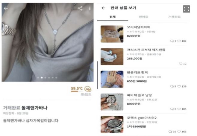 화제가 된 판매자는 서울 서초구를 중심으로 고가의 시계와 팔찌 등을 다수 판매했는데 판매자의 판매물품 중에 피아제 폴로 남성 시계, 오리지날 피아제 시계, 롤렉스 GMT마스터2 등이 있는 것으로 보아 판매자는 고가의 상품을 잇따라 판매한 것으로 보입니다. 각각 8,999만 원, 8,200만 원, 1억 6,500만 원에 판매됐습니다.