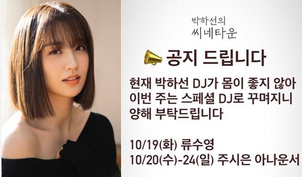 이어 "현재 박하선 DJ가 흡인성 폐렴으로 입원 치료 중이어서 이번 주는 스페셜 DJ로 진행된다. 19일 화요일 류수영, 20일~24일 주시은 아나운서"라고 알렸습니다.