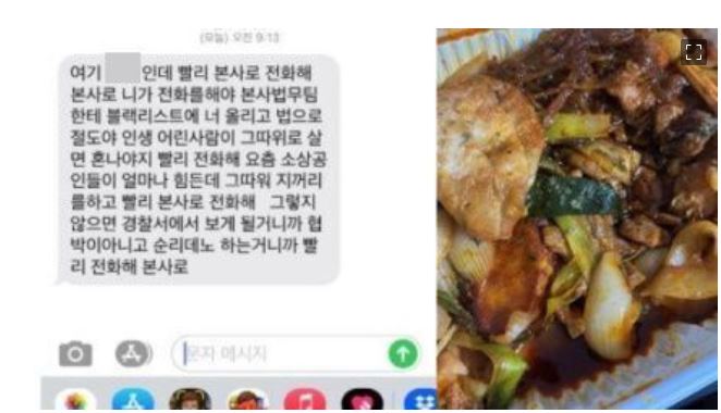 - 메시지 내용에 따르면 점주는 "여기 두찜인데, 빨리 본사로 전화해. 본사로 네가 전화를 해야 본사 법무팀한테 블랙리스트에 너 올린다. 어린 사람이 그따위로 살면 혼나야지. 요즘 소상공인들이 얼마나 힘든데 그따위 짓을 하고. 빨리 전화해. 그렇지 않으면 경찰서에 보게 될 거니까"라고 말함.