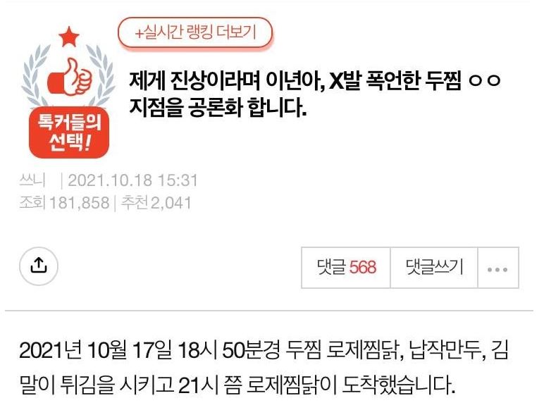 - 글에 따르면 A씨는 2021년 10월 17일 오후 6시 50분경, 찜닭 업체 B지점에서 로제찜닭, 납작만두, 김말이 튀김을 주문했으며 음식은 오후 9시쯤 도착함.