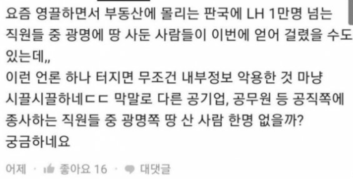 다른 직원은 '요즘 영끌 영혼까지 끌어모은다하면서 부동산에 투자가 몰리는 판국에 LH 1만명 넘는 직원들 중 광명에 땅 사둔 사람들이 이번에 얻어걸렸을 수도 있다. 하나 터지면 무조건 내부정보 악용한 것 마냥 시끌시끌하다. 막말로 다른 공기업·공무원 등 공직에 종사하는 직원들 중 광명 쪽 땅 산 사람 한 명 없겠느냐'고 주장했습니다.
