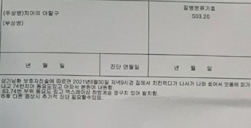 A씨가 제시한 사진과 병원 진단서 등을 보면 초등학교 5학년인 그의 아들 B군은 C 업체 치킨을 먹다 잇몸을 나사에 찔려 피를 흘리는 모습입니다. 또한 치과병원 진단서에는 이가 흔들려 2개를 뽑았으며 추가 진단이 필요할 수 있다는 기록이 있습니다. (사진 첨부)