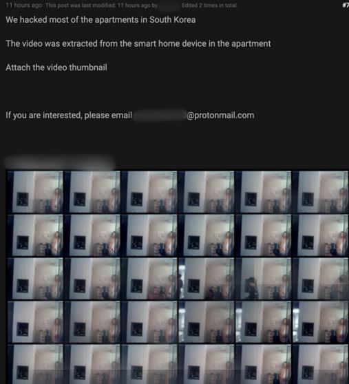 언론에 따르면, 한국의 다양한 아파트 내부에서의 일반인 가정 생활상이 담긴 영상들이 다크웹 상에서 공개되어 판매되고 있었는데 영상의 가격은 하루 치 기준으로 0.1비트코인(800만 원)에 판매되고 있습니다. 해커가 소유했다고 주장하는 영상의 섬네일에는 전라가 노출된 장면, 성관계 장면 등 적나라한 사생활이 담긴 자극적인 이미지도 상당수 포함되어 추가 범죄가 우려되는 상황입니다.