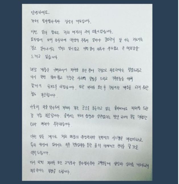 그러면서 '해당 제품을 구매하시어 피해를 보신 분께 진심으로 죄송하다는 말씀드리고 다시 한번 찾아뵙고 진중한 사과의 말씀을 드리고 가족분들을 위해 끝까지 힘쓰도록 하겠습니다. 또한 피해를 보신 후 진심 어린 대응을 하지 못한 점도 죄송합니다'라고 설명함.