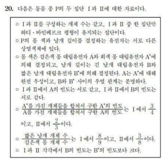 - 논란이 된 생명과학2 20번은 주어진 지문을 읽고 두 동물 종 집단 가운데 하디, 바인베르크 평형이 유지되는 집단을 찾고 이를 바탕으로 선택지 3개의 진위를 가려낼 수 있는지 평가하는 내용임.