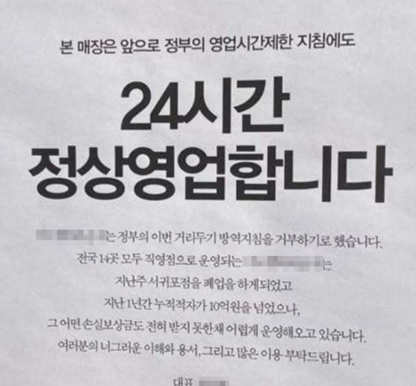 - 카페 측은 "본 매장은 앞으로 정부의 영업시간 제한 지침에도 24시간 정상영업한다"라며 "정부의 이번 거리두기 방역지침을 거부하기로 했다"고 밝힘.