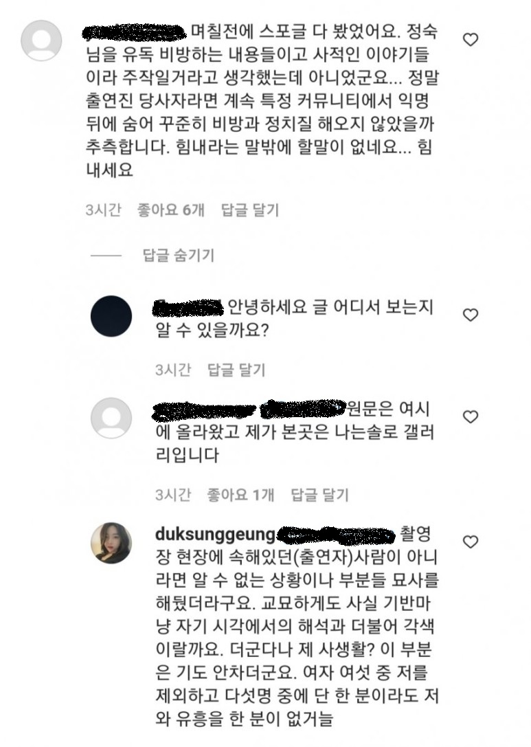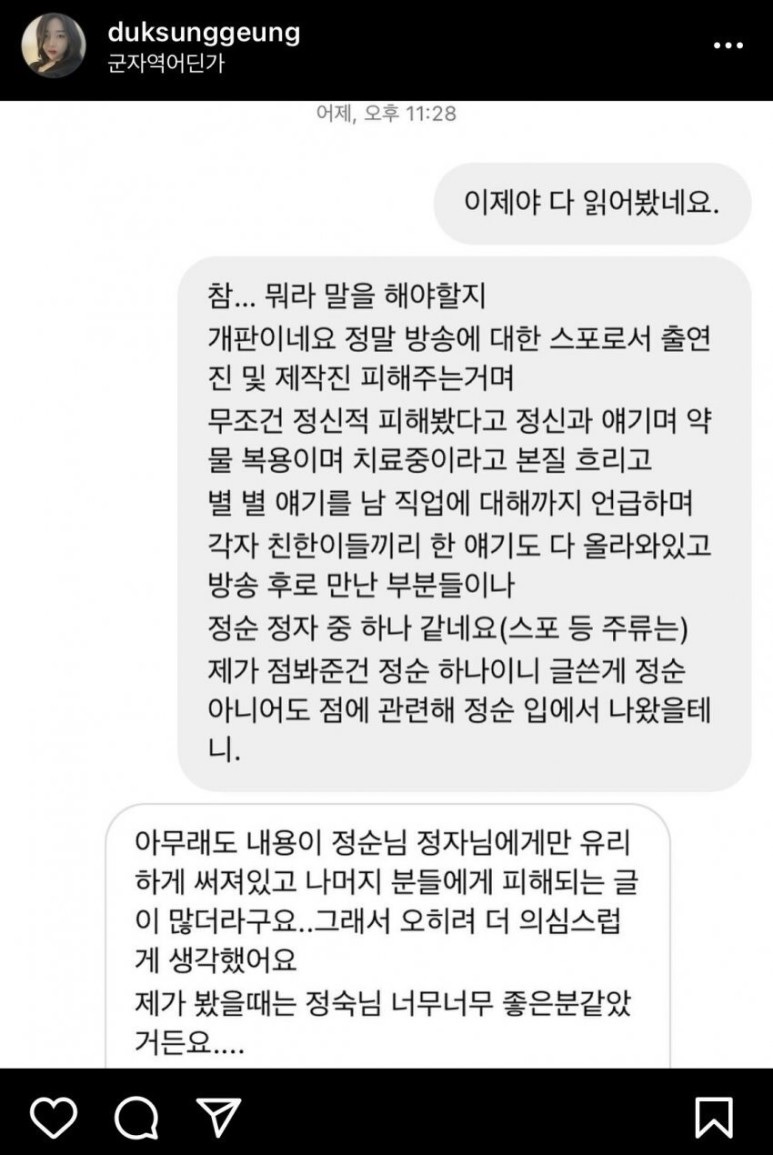 - 2021년 12월 22일, 나는솔로 정숙 인스타그램에 팬과 대화한 메시지 캡쳐가 게재됨