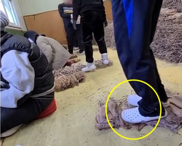 - 영상 속에서는 근로자들이 바닥에 건조 오징어를 늘어놓고 흰색 운동화를 신은 발로 밟고 있었음