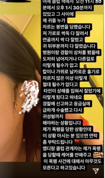 A씨는 자신의 사회관계망서비스(SNS)와 각종 온라인 커뮤티를 통해서도 피해를 호소했습니다. 그는 귀가 잘린 사진과 함께 "강남의 한 클럽에 오전 11시 30분에서 오후 1시 30분까지 있었고, 그 사이에 제 귀가 잘리는 봉변을 당했다"고 피해 사실을 밝혔습니다.