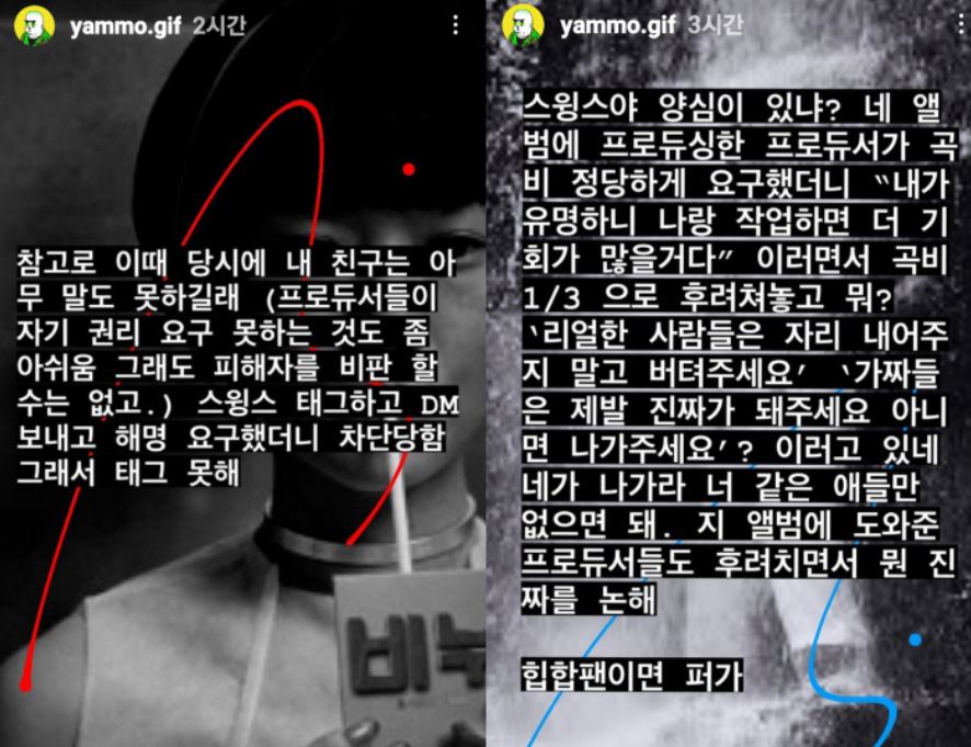 - 또한 "이 때 당시 내 친구는 아무 말도 못하길래 스윙스 태그하고 DM(인스타그램 다이렉트 메시지)를 보내고 해명을 요구했더니 차단까지 당했다"며 스윙스가 타 프로듀서로부터 곡 비를 저렴하게 받거나 공짜로 받은 적이 많다는 타인의 메시지를 공유함.