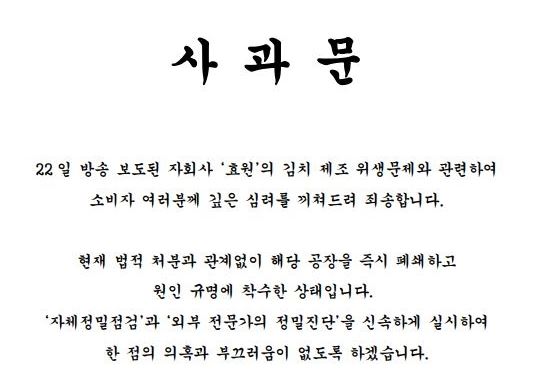 - "22일 보도된 자회사 '효원'의 김치 제조 위생 문제와 관련해 소비자 여러분께 깊은 심려를 끼쳐 죄송하다."